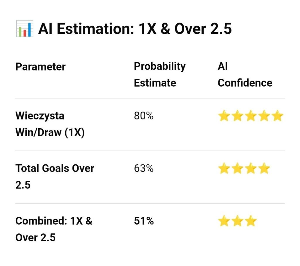 🥈 Wieczysta Kraków ML – 54% AI Confidence (Driven by their 10-match unbeaten momentum).