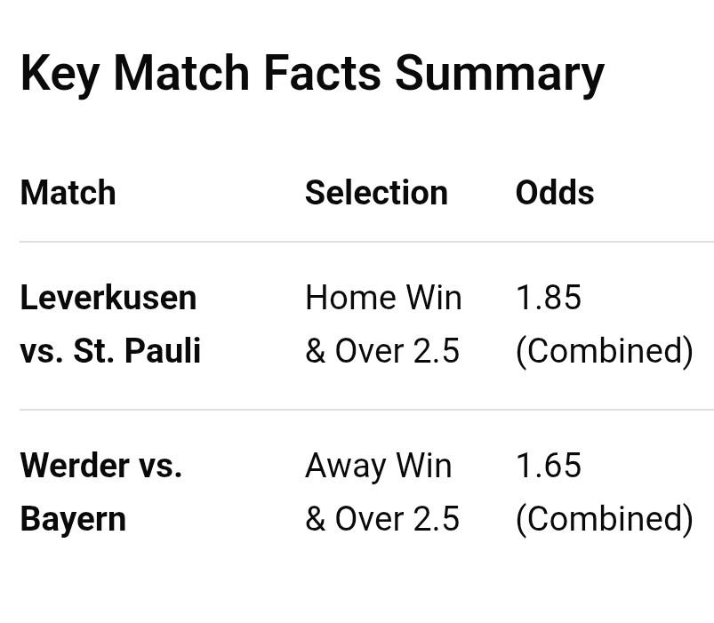 Leverkusen’s attacking depth—led by Patrik Schick and Florian Wirtz—should overwhelm a St. Pauli defense that has conceded 35 goals this season. While Leverkusen has struggled for clean sheets, their technical superiority (88.7% pass accuracy) makes a home win combined with goals the most logical play.
